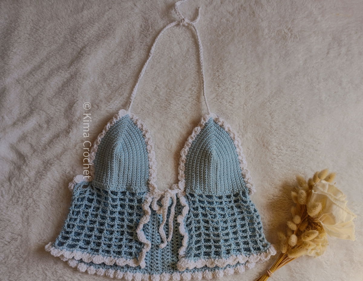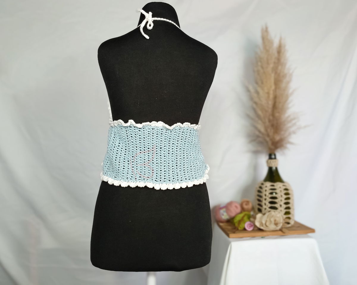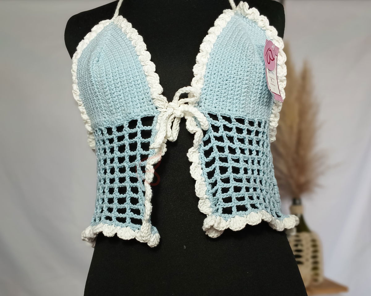 Tejido a mano en hilo de algodón 8/6. Se regula con lazo en el cuello y en el busto haciéndolo totalmente adaptable.