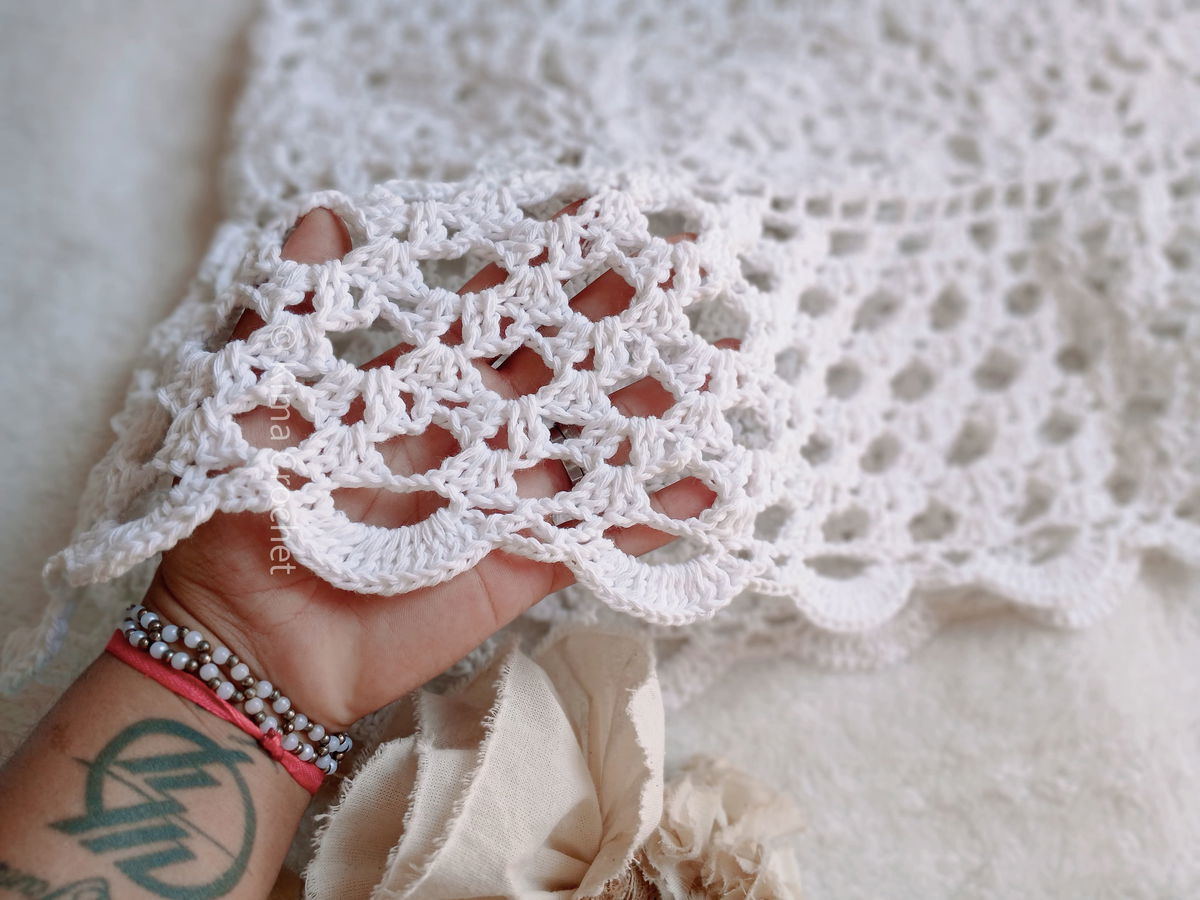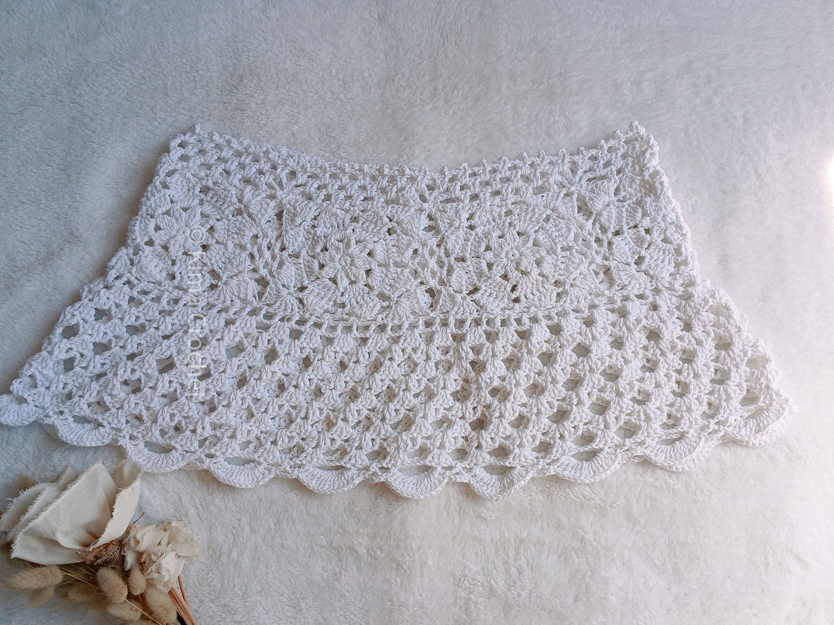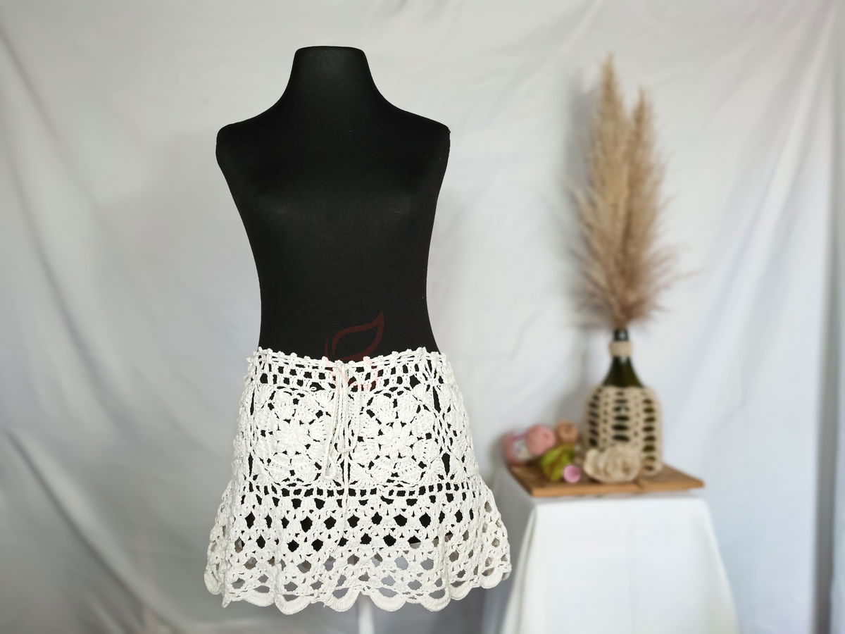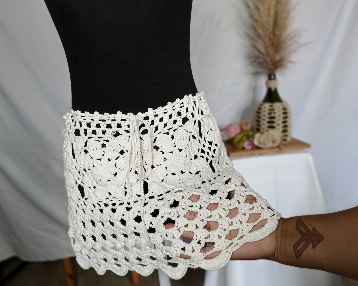 Tejido a mano en hilo de algodón 8/6.Se regula en la cintura con un lazo en caso de que gustes.