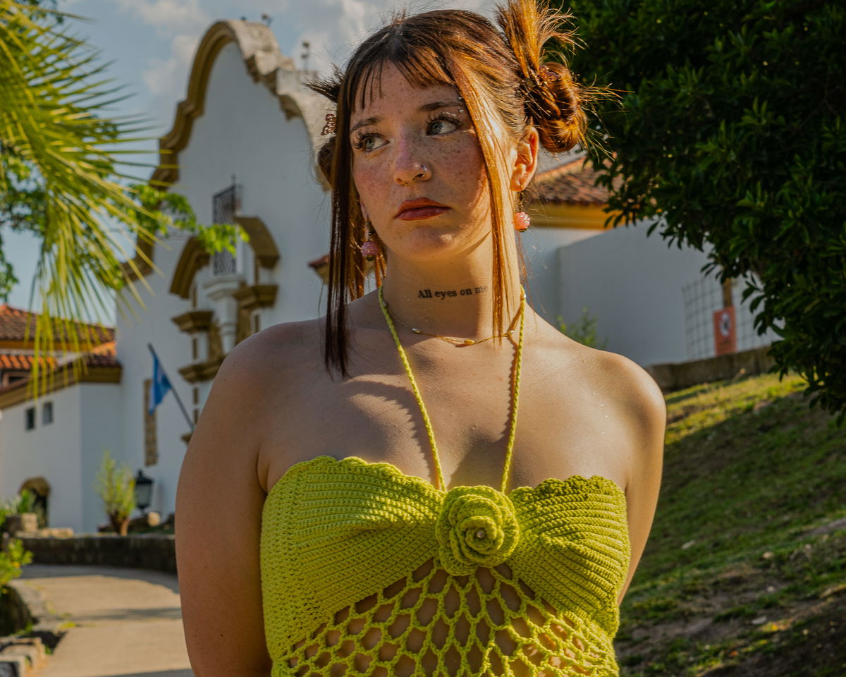 Tejido a mano en hilo de algodón 8/6. Se regula con lazo en el cuello y en la espalda haciéndolo totalmente adaptable.